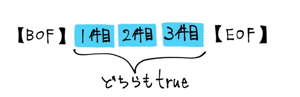 EOFは”最後”(End)、BOFは”最初”(Beginning)と覚えておけばとりあえず流したSQLの何が存在して存在しないのかわかるかなと思います。