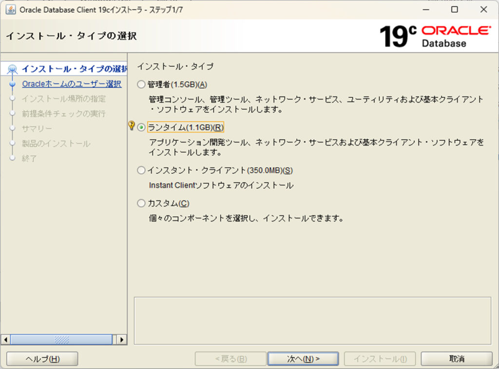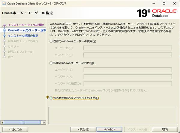 今回はローカルなので「windows組み込みアカウントの使用」で進めますが、複数の Oracle Home を異なるユーザーで分離したい場合やActive Directory(AD)環境での運用の場合はその時の環境に合わせてユーザーを指定してください。