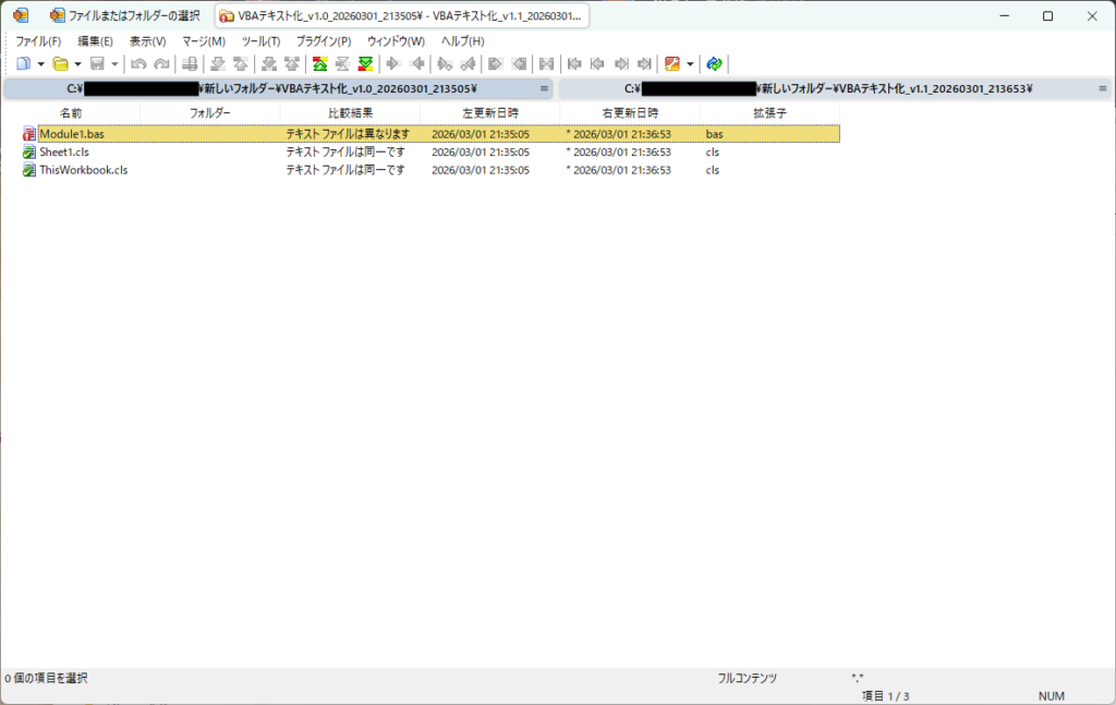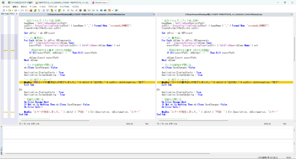 sourcetreeのように複数人開発はできませんが(VBAでそれはもうないと思いますが…)このように差分を取ることでバージョン管理も一応できます。