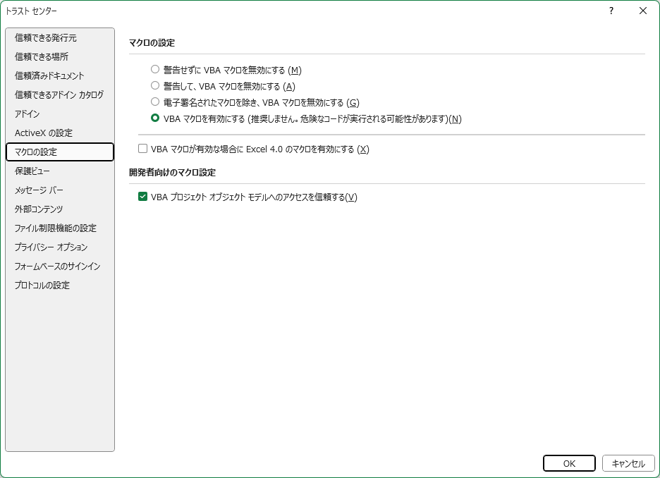 ・VBAプロジェクトオブジェクトモデルへのアクセス信頼